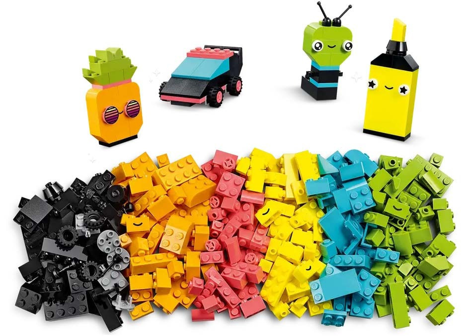Kids who like bright colors will love this inspiring mix of neon-colored bricks. There are 5 easy-to-assemble models to build their confidence – a pineapple, highlighter marker pen, car, alien and roller skates – and endless free-building fun to explore! They can even bring their colorful creations to life using the set’s 18 eye bricks.