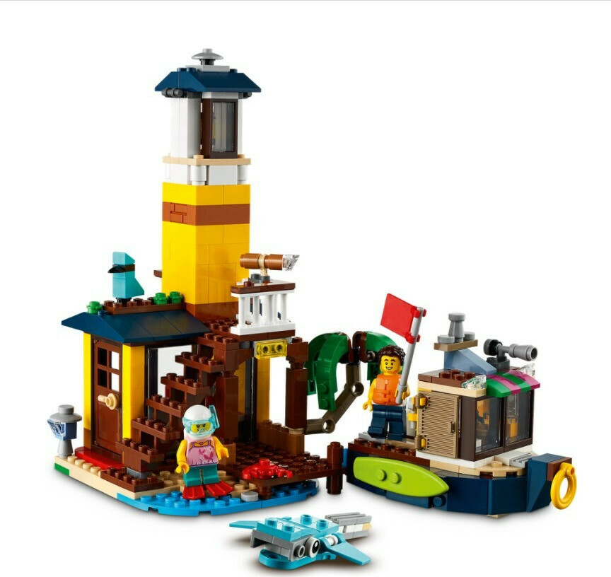 Get ready to hit the beach and catch a big wave! Have fun at the Surfer Beach House where you can grab a surfboard before jumping in the ocean. Woah! Look out for the friendly dolphin and sea turtles swimming with you. Later, rebuild it into to a lighthouse where you can sail on a boat and dive with a manta ray, or construct a pool house. The choice is yours with this incredible 3in1 set!