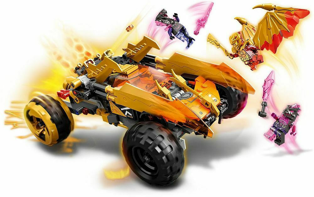 Launch into an epic battle in Cole’s Dragon Cruiser! The evil serpentine General Aspheera has stolen Kai’s elemental weapon and you need to win it back. Woah! Beware of the Vengestone Brute and his dangerous crystals. Fight back with speed and power by transforming the cruiser into golden dragon attack mode. Only you can stop the ninja’s enemies turning everyone in NINJAGO® City into zombies!