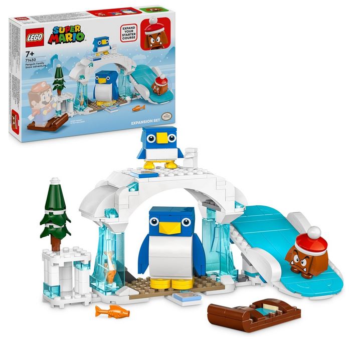 Join the penguin and baby penguin for a magical snow world adventure! Have fun together in the cave… but watch out for that Goomba. Sled down the ice slide, then turn the slide into an ice rink for skating. And if you want an interactive digital adventure, help LEGO® Mario™, LEGO® Luigi™ or LEGO® Peach™ (figures not included) reunite the baby penguin with its parent!