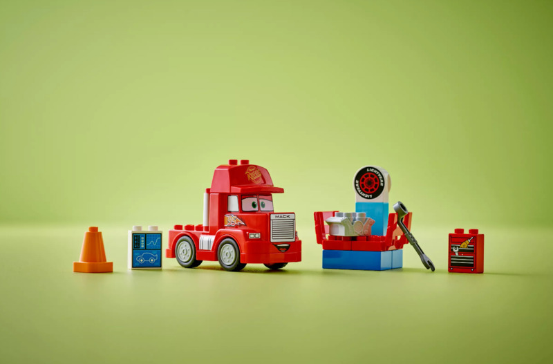 Fuel kids’ imaginations with this set showcasing the much-loved transporter from the Disney and Pixar Cars movies. With LEGO® DUPLO® | Disney and Pixar’s Cars Mack at the Race, toddlers imagine teaming up with the hauler to support Lightning McQueen on race day. In the garage is a computer to check Lightning’s stats, a wrench and a spare engine to get the red race car tuned up and ready to win!