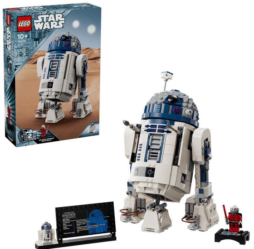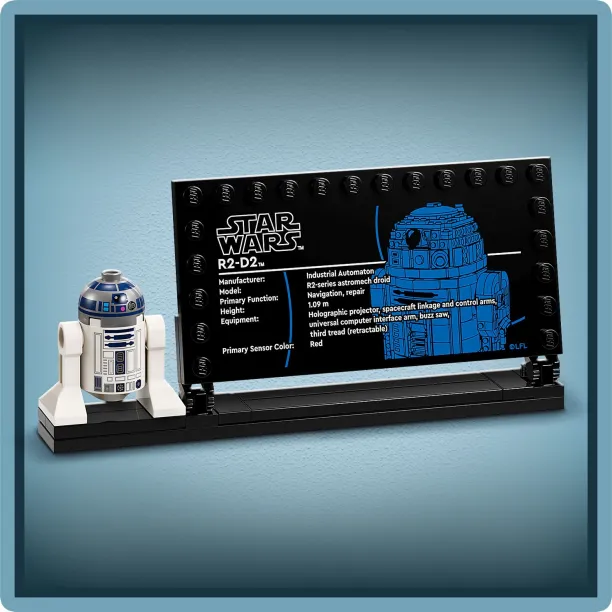 Invite the most beloved droid in the Star Wars™ universe into your home with this playful, buildable model. Rotate R2-D2’s head and attach his third leg when it’s time to move. You can also connect his iconic radar and tools. Showcase your creation with the R2-D2 information plaque, an R2-D2 LEGO® figure and a special LEGO Star Wars 25th anniversary minifigure of Darth Malak with a display stand.