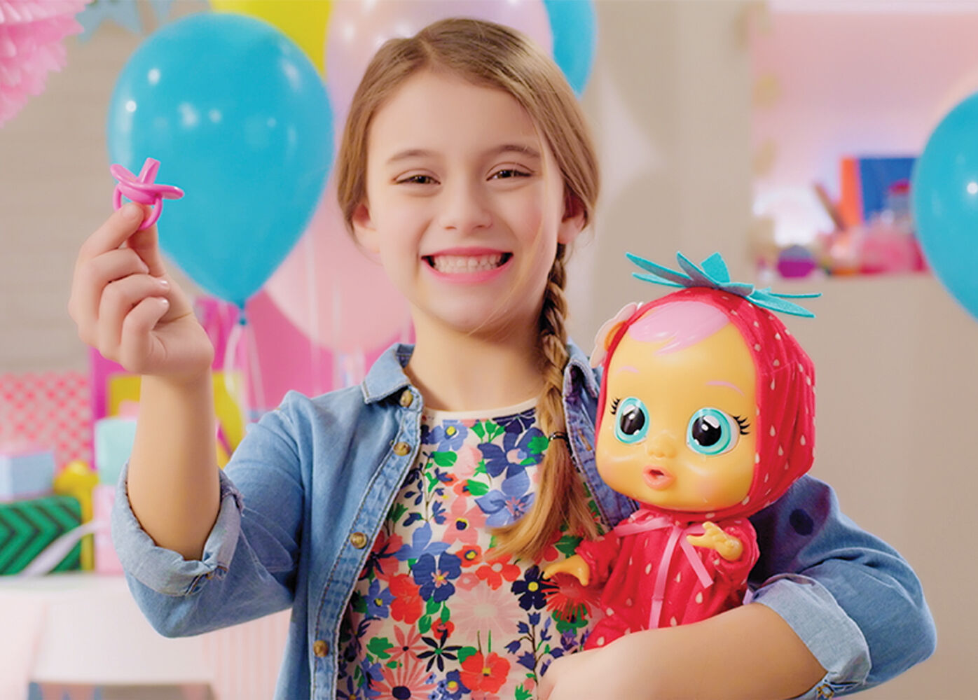 Travel to Tutti Frutti Beach with the Cry Babies, where all characters wear fruit-themed pajamas and share the same fruity scent, and meet Ella, who resembles a bright red strawberry, smells wonderful, and has a flower on her hood. Each Cry Babies Tutti Frutti doll comes with colorful fruit pajamas and 1 pacifier, and by simply adding water she will cry real tears. The Cry Babies are interactive baby dolls that, when their pacifier is removed, cry real tears and make baby-like sounds, and if you give them back their pacifier and take care of them, they will stop crying.
