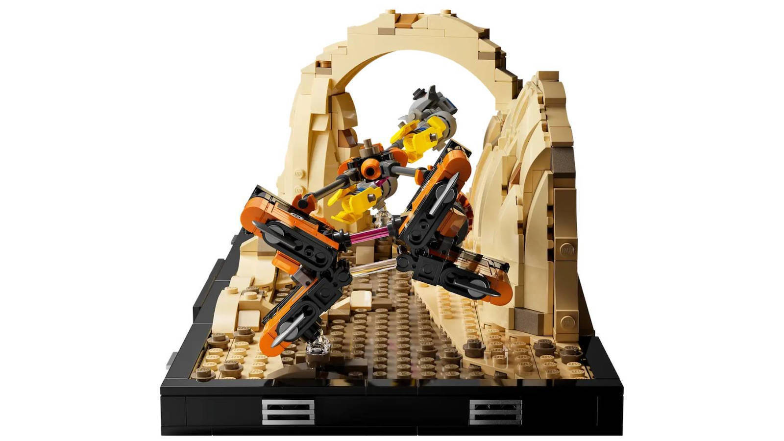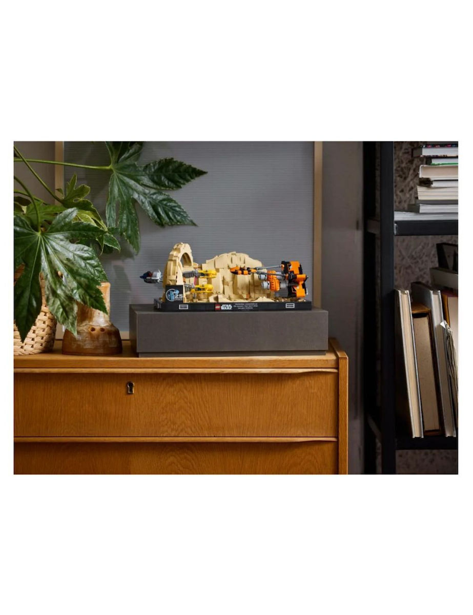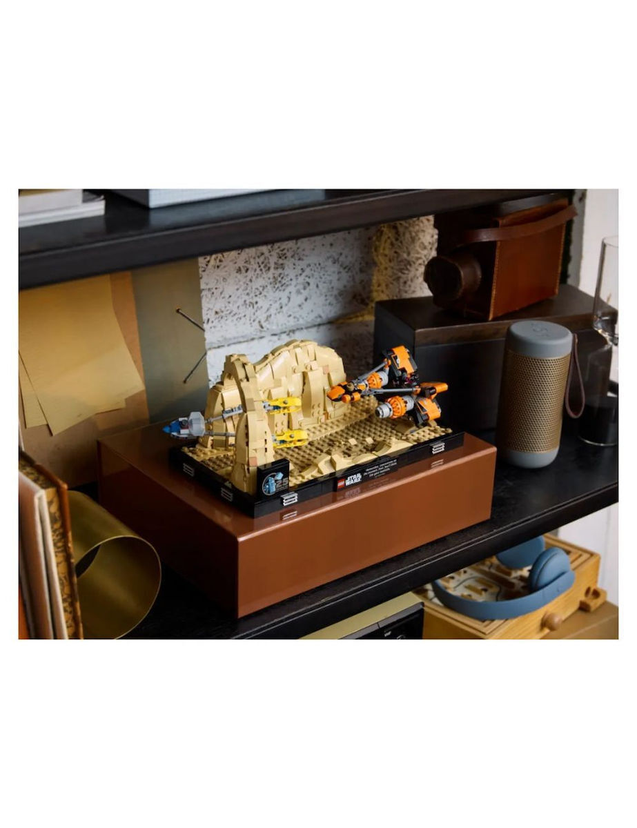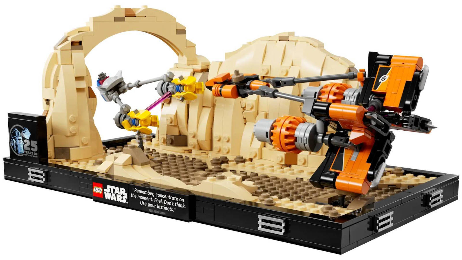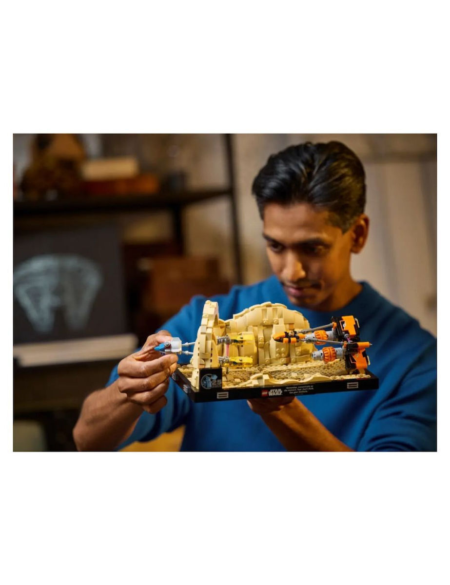 Build a dynamic snapshot of the Mos Espa Podrace on Tatooine with this LEGO® Star Wars™ diorama. Capture Anakin Skywalker speeding through Arch Canyon in pursuit of his racing rival Sebulba. Attach the plaque with Qui-Gon Jinn’s advice: “Remember. Concentrate on the moment. Feel. Don't think. Trust your instincts.” Add the LEGO Star Wars 25th anniversary brick to complete a nostalgic centerpiece.