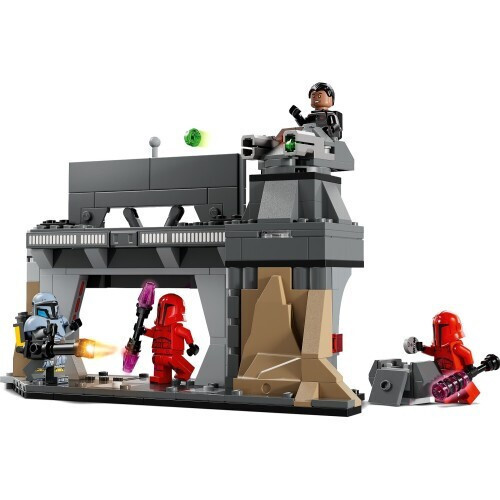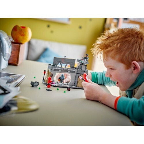 Moff Gideon, wearing his Dark Trooper armor, and the Imperial Praetorian Guards are attacking the Mandalorian underground base! Slam the heavily armored door and help Paz Vizsla fend them off. Target the invaders with his heavy blaster and the rotating, stud-shooting turret. But beware of Moff Gideon’s flying jetpack attacks! Can the brave but outnumbered Paz Vizsla save the day?