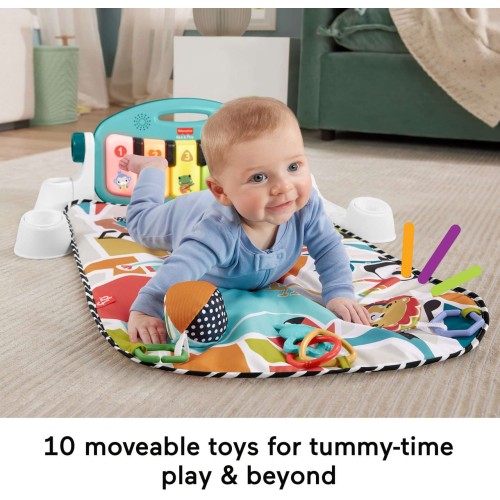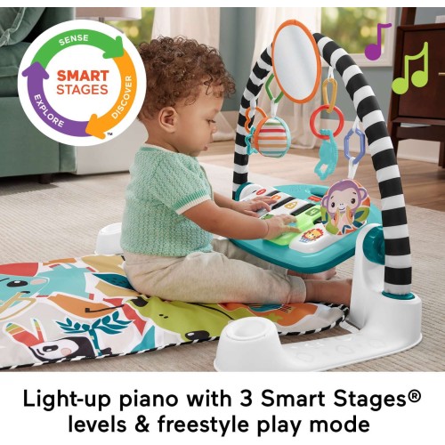 The Fisher-Price® Glow and Grow™ Kick & Play™ Piano Gym helps your little one move, groove, and learn all in one activity. The soft baby mat features a repositionable high-contrast toy arch with 10 linkable toys, while the removable piano with 5 light-up keys includes a multi-colored light show and 4 musical settings that grow with your child. With 3 Smart Stages™ learning levels and a freestyle mode with real piano notes, fun continues from tummy time to sitting up and making music.
