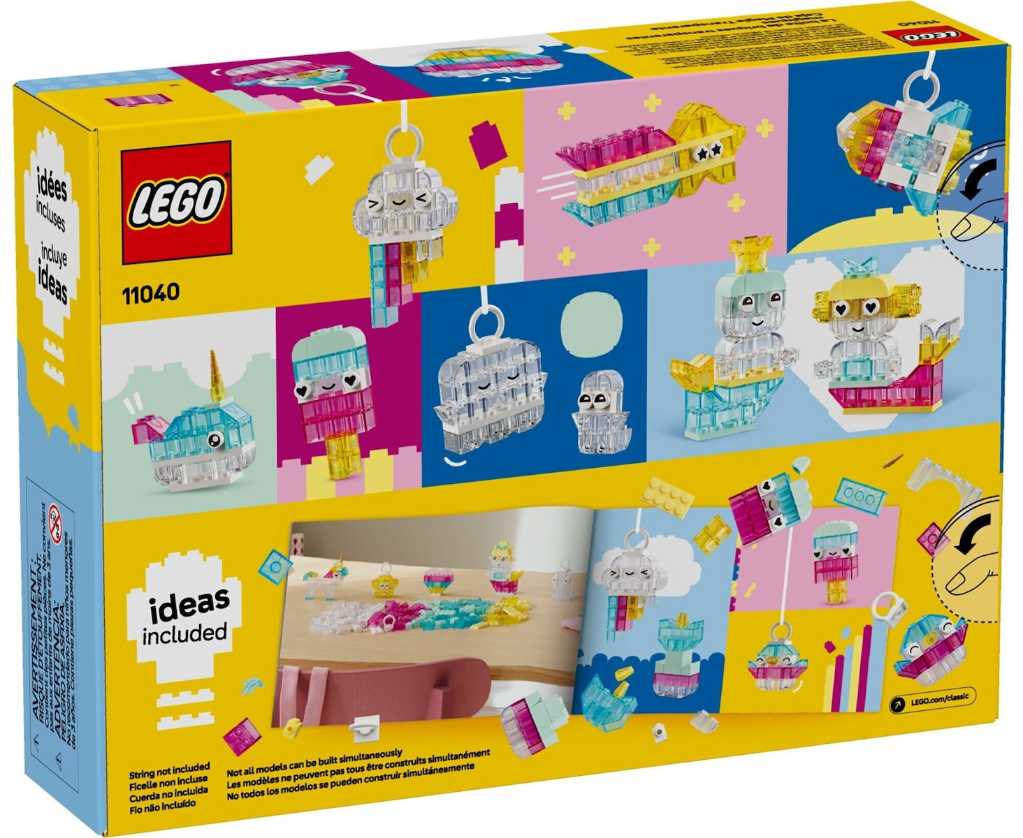 Create magical models with colorful, translucent bricks! Build a heart, ghost, mermaid, star, unicorn, spaceship, cloud, shooting star, bird, narwhal, ice cream and a flower, plus imaginative designs of your own. Then, scale up the creative fun with a large castle and dragon! With hanger-bricks for creating a dangling display, your transparent creations will bring see-through sparkle to any room.