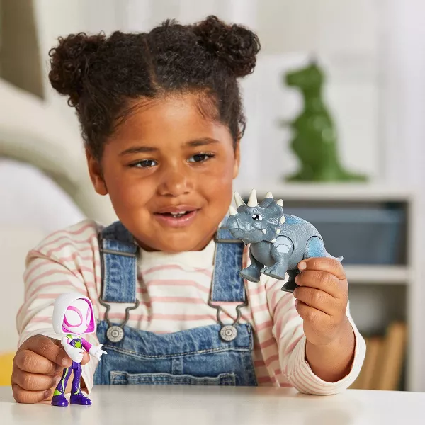 Join Team Spidey on their latest dino adventures with this Marvel Spidey and His Amazing Friends Ghost-Spider and Rhino Dino toy set! This action figure set includes a poseable 4-inch Ghost-Spider toy figure with updated Dino-Webs suit deco, and a poseable Rhino Dino baddie to encourage big, imaginative adventure play for preschoolers ages 3 and up. Collect all characters and look out for even more Spidey and His Amazing Friends toys for web-slinging, Dino-Webs action!