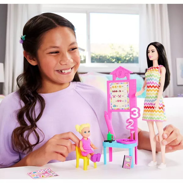 Get ready to learn with the Barbie Teacher fashion doll! Barbie teaches her toddler student wearing her removable printed dress and shoes. The set includes stickers to place on the board that bring teaching storytelling to life! With other classroom accessories like safety scissors, backpack, and a chair for the toddler student, imaginations can create a world full of storytelling possibilities and career opportunities with this empowering doll, ready to inspire kids to be anything they dream of! The doll cannot stand alone. Colors and decorations may vary.