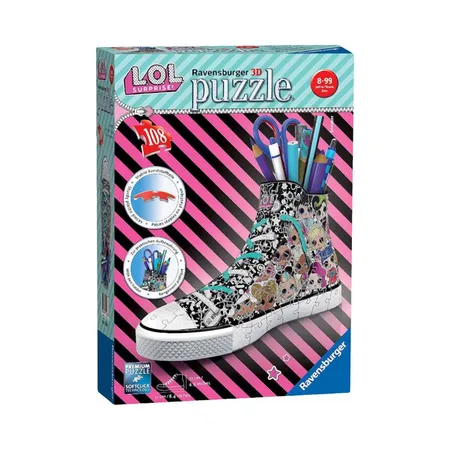 The LOL Surprise Sneaker 108pcs Puzzle by Ravensburger is the perfect choice for children aged 8+ years who love 3D puzzles and creativity. With 108 numbered plastic pieces and accompanying accessories, kids can assemble a unique 3D sneaker, offering hours of fun while developing concentration and imagination. The puzzle comes with illustrated instructions that make the assembly process easy and enjoyable, and the final result serves as a beautiful decorative piece for the room or desk.