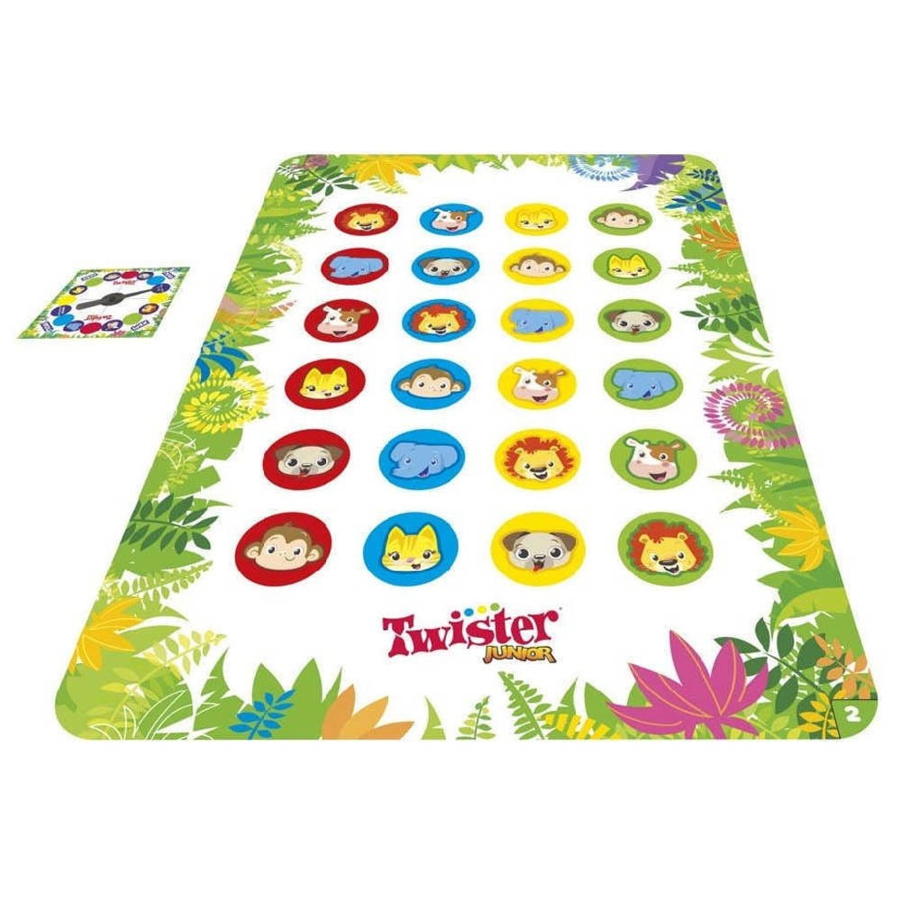 The Twister Junior game is fun and designed for children aged 3 and up. It includes a double-sided mat offering two different game levels for more variety and enjoyment. On the first side, Animal Safari, children spin and move along the safari path, discovering colors and mimicking animal sounds and movements. Flip the mat to enter the second level, Animal Party, where players spin the spinner and place their hands or feet on specific colors or animals. The last player standing wins! This game is made for 2 to 4 players, perfect for family fun.