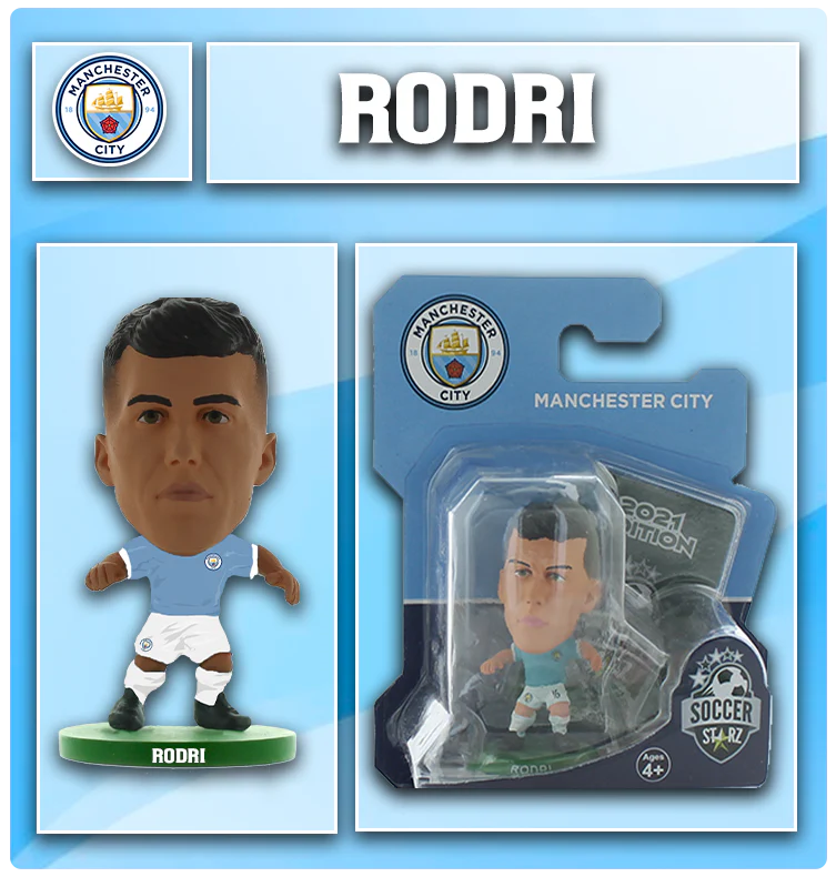 The collectible Rodri SoccerStarz figure showcases the Manchester City midfielder in the classic home kit, perfect for any fan of the club. The figure stands approximately 5 cm tall on a green base, offering a detailed and accurate representation of the player. It is officially licensed and suitable for children aged 4 and above, making it an excellent addition to any football figure collection.