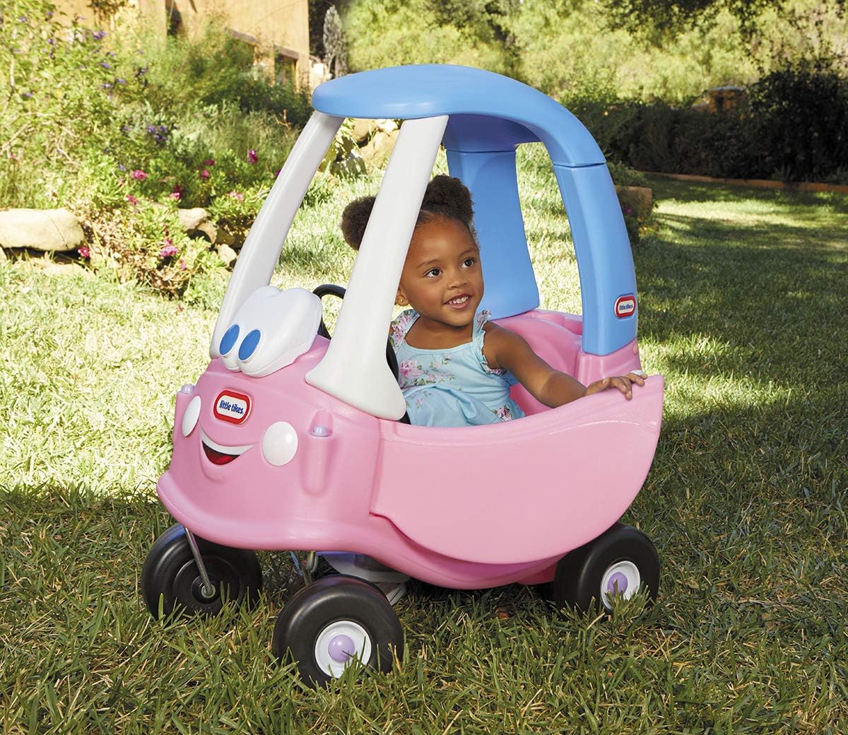 This 30th Anniversary Princess Cozy Coupe® from Little Tikes is a vehicle with a princess-style design that children will love. It features a handle on the back for parent-controlled push rides and a removable floorboard that can be left in to protect little ones’ feet or removed to allow kids to use foot-to-floor power. The Coupe is designed with a high seat back, cup holders in the rear, a moving, clicking ignition switch, and a gas cap that opens and closes. It rolls on rugged, durable tires, with front wheels that spin 360 degrees.