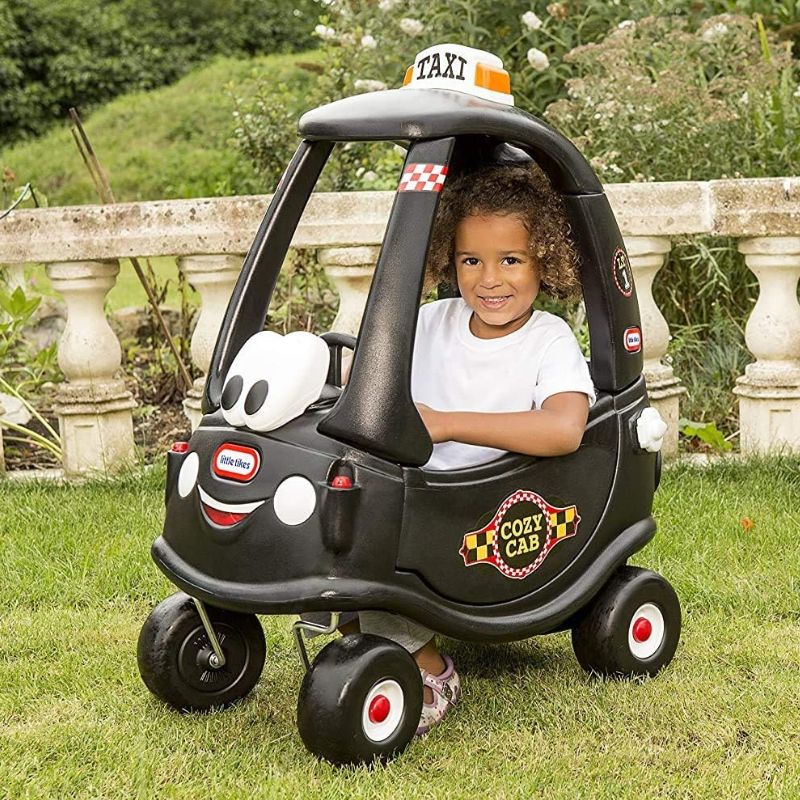 Catch a ride on our Cozy Coupe Cab, now in a fun black taxi version! This vehicle features a handle on the back for parent-controlled push rides and a removable floorboard that allows kids to use foot-to-floor power. It is designed with a high seat back and storage in the rear. It also includes special features, such as a clicking ignition switch and an open-and-close gas cap, making playtime even more exciting.