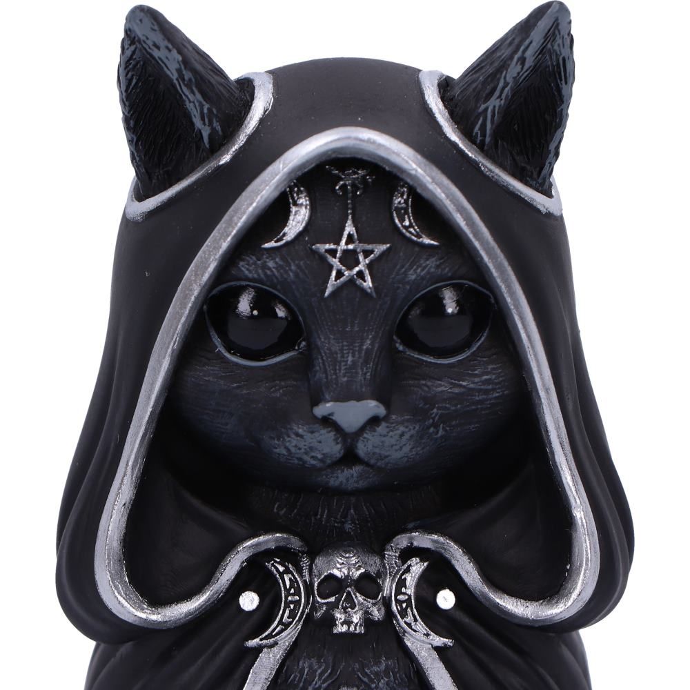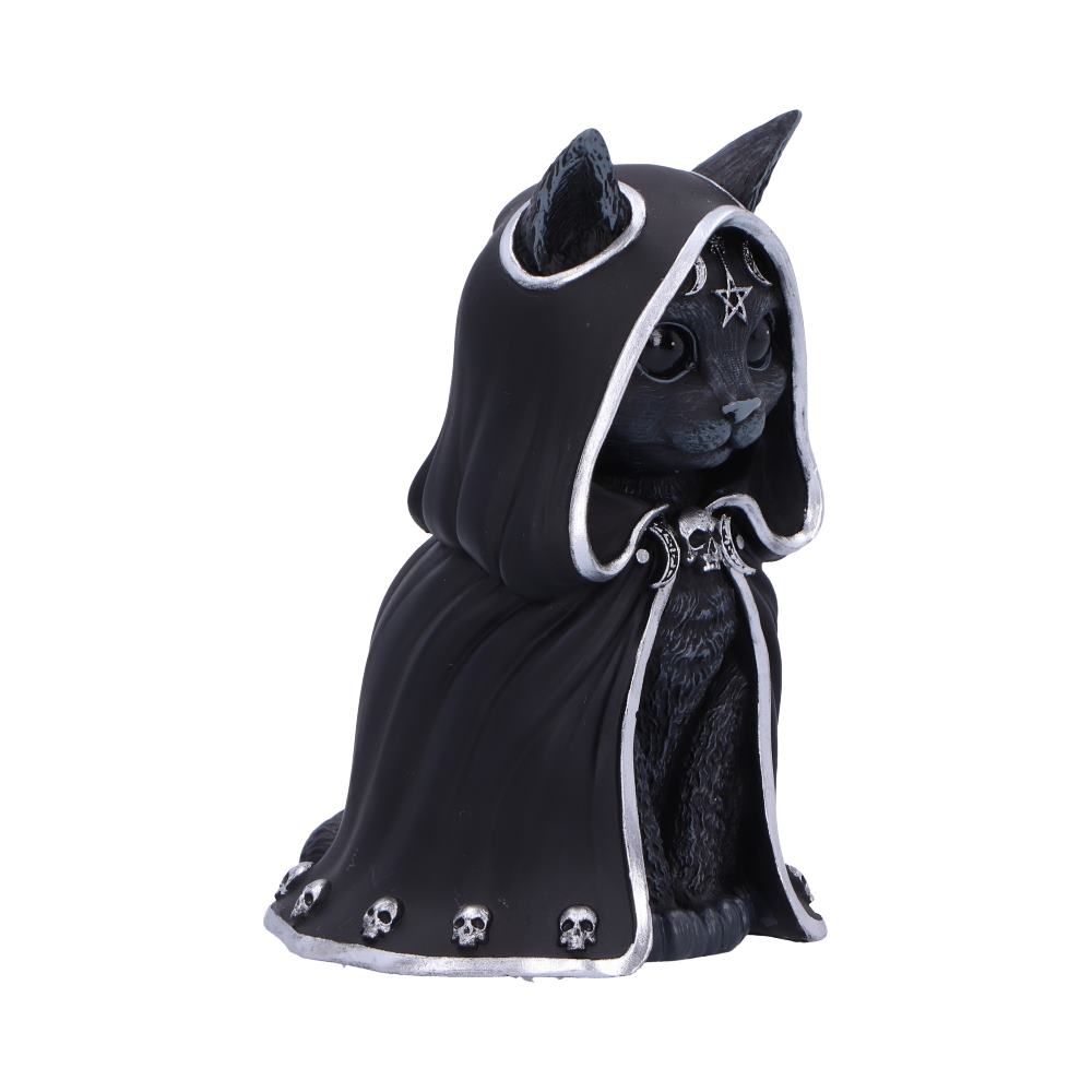 Unleash magic with Zefur, the enchanting Cult Cuties™ collectible from Nemesis Now! Zefur, the cute occult cat, radiates mystery and magic, captivating everyone who lays eyes upon him. Nestled within a flowing black cloak adorned with silver skulls, his ears peek mischievously from the top, hinting at his playful nature.
