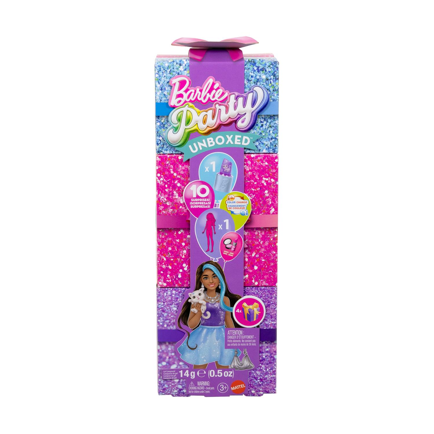 The Barbie Reveal: Glam Party Unboxed - Brunette Doll turns unboxing into a true celebration with 10 surprises hidden in 4 gift boxes! Start by opening the first gift to find Barbie dressed in a bath towel, hair towel, and face mask. Remove them to reveal the Purple Sparkle Doll with a petite poseable body and long brunette hair. Continue unboxing to discover fashion accessories hidden inside a compact case, revealed by poking through with the included makeup brush. Open the lipstick-inspired tube to find colorful jelly slime hiding an adorable kitten inside! Then help Barbie get ready for the party: her bath towel reverses into a purple and blue party dress, and complete her look with a bow, necklace, earrings, and shoes. The fun continues with color-change play, revealing her makeup and hair streaks using warm and icy water again and again. A perfect gift for kids ages 3 and up who love glam and party fun!
