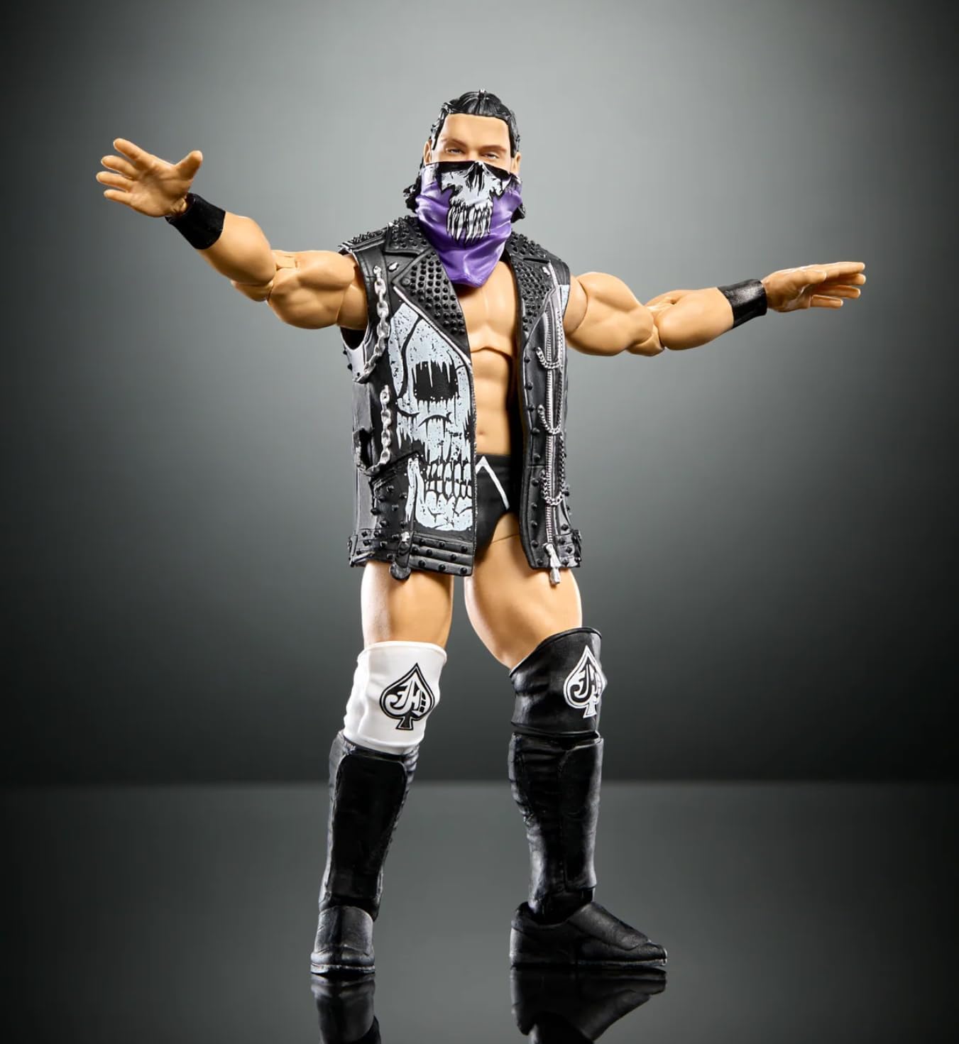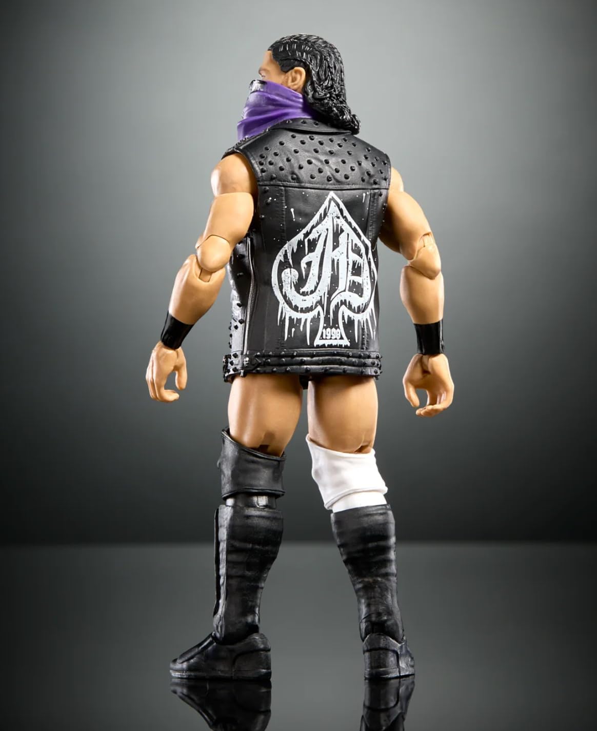 He comes wearing black trunks with monogrammed spade logo, mismatched black and white logo knee pads, and black boots. McDonagh stands alongside the Judgment Day with a molded black biker entrance vest featuring a white skull illustration and a spray-painted spade logo on the back. Accessories include two additional sets of hands and a purple neck gaiter with skull design. Collect all four Elite Survivor Series figures to complete the exclusive Nick Aldis Build-a-Figure!