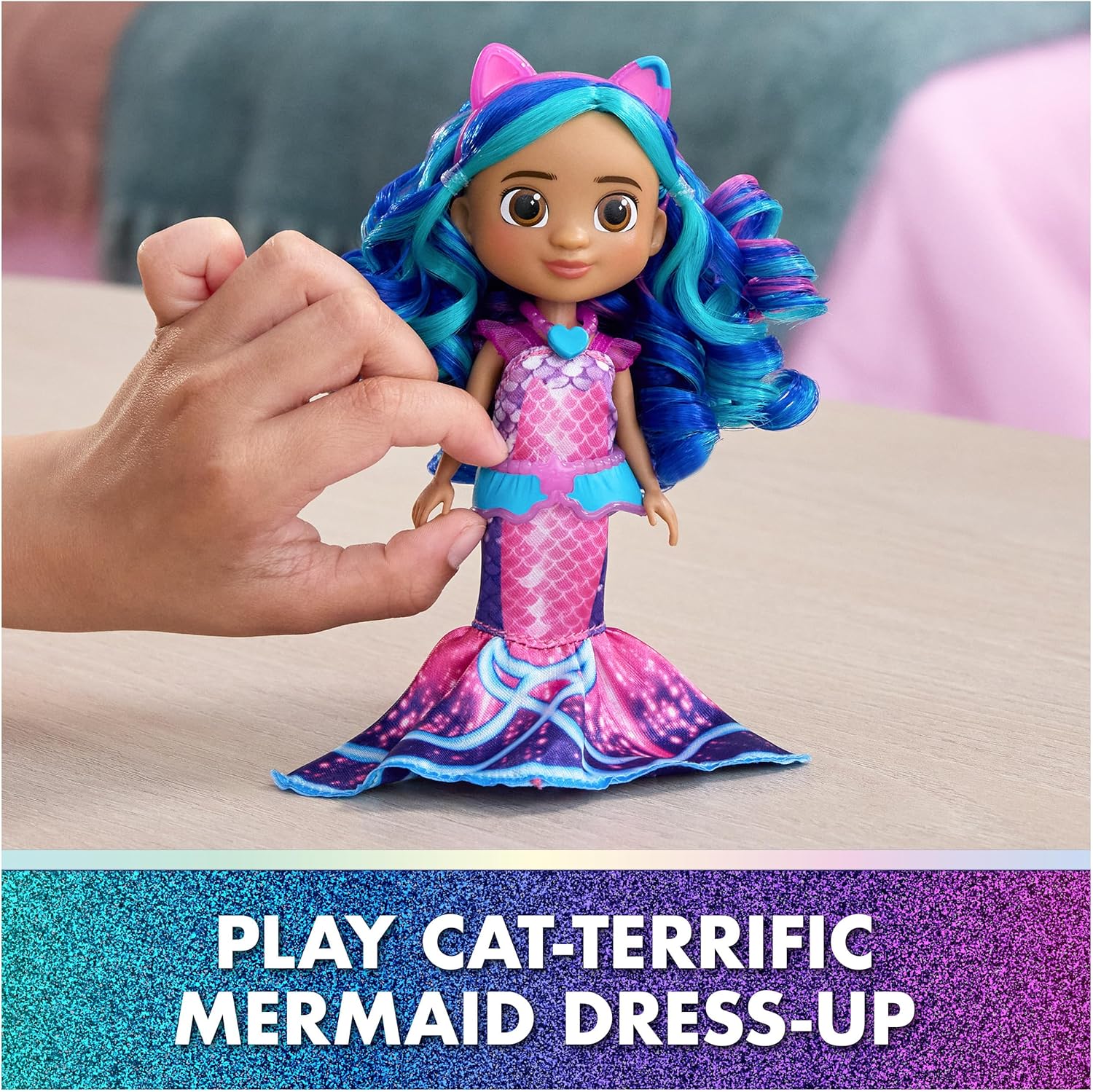 Gabby looks exactly like she does in the movie, wearing her shimmering mermaid tail dress and removable cat ears headband, ready for undersea fun! Kids can recreate their favourite movie moments or invent new magical stories with Gabby and all her meow-mazing cat friends (each sold separately). Perfect for encouraging creativity, storytelling, and role play, this doll makes an ideal gift for young Gabby’s Dollhouse fans.