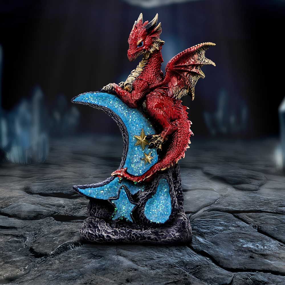 Ideal for fantasy collectors, celestial décor themes, and shops offering premium gothic and mystical items, the Lunar Perch brings a unique blend of starlight serenity and legendary fire, making it a perfect addition to magical displays, alternative décor setups, or as a gift for lovers of dragons and the night sky.