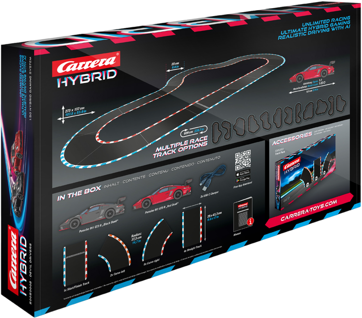 The Carrera Hybrid Racing line brings thrilling racing fun to your home with the Devil Drivers set. The 6.09-meter track features straights and curves for exciting races, offering a unique driving experience. Adjustable vehicle settings ensure every race is different, while the realistic Porsche 911 GT3 R "Black Devil" and "Red Devil" models provide authentic track handling and visually impressive detail.