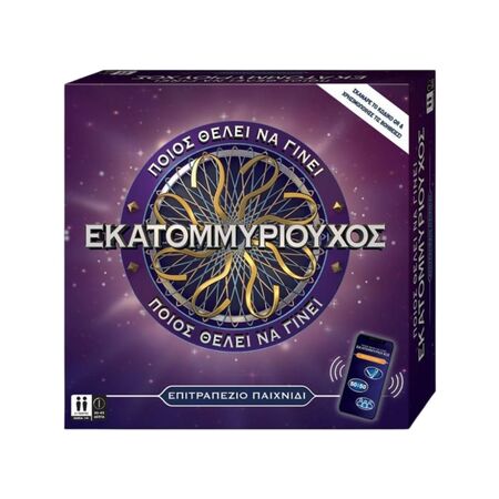 Το πιο αγαπημένο τηλε-παιχνίδι γνώσεων "Ποιος θέλει να γίνει Εκατομμυριούχος" τώρα και σε Επιτραπέζιο! Παίξτε με τους φίλους ή την οικογένεια! Χρησιμοποιήστε γρήγορα & απλά τις βοήθειες* σκανάροντας με την smart συσκευή σας (δεν περιέχεται) τον κωδικό QR που βρίσκεται πάνω σε κάθε κάρτα, απαντήστε πρώτοι σωστά σε δώδεκα ερωτήσεις και γίνετε ο νικητής του παιχνιδιού! Περιεχόμενα: 1 ταμπλό, 720 ερωτήσεις, 24 μάρκες απαντήσεων, 6 πιόνια, 6 πιόνια/μαξιλαράκια, 18 μάρκες βοήθειας (3 είδη βοήθειας).