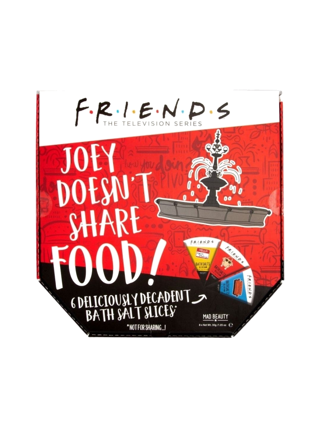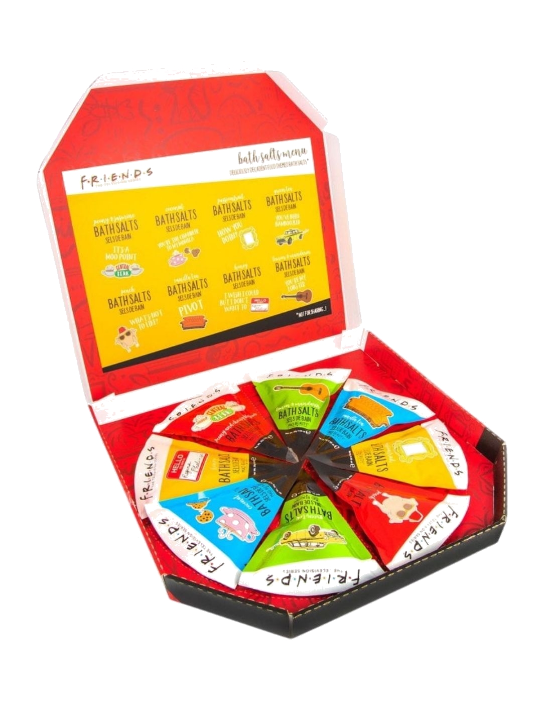 Friends Pizza Slices Bath Salts – Pizza! We love pizza, especially our new Friends Superfood Bath Salts Pizza Box! This set includes 8 delightful slices of bath salts with different scents to turn your bath time into a delicious experience.