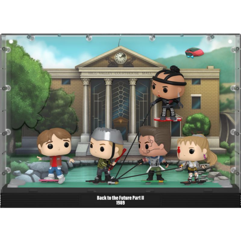 Relive one of the most iconic moments from Back to the Future Part II with the Pop! Deluxe Moment: Hoverboard Chase Scene #11! Pop! Marty McFly races across the futuristic pond on his hoverboard, trying to escape a wild chase from Pop! Griff Tannen, Pop! Data, Pop! Whitey, and Pop! Spike, all captured in a dynamic, movie-accurate display. The figures are securely adhered to a detailed backdrop, ensuring scene integrity and effortless showcasing. Comes in window box packaging for easy display, making it a standout centerpiece for any Back to the Future collection.