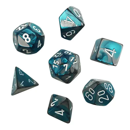 The Gemini Steel-Teal/White Mini Set blends elegance with functionality, bringing a distinctive aesthetic to your game table. Crafted with high-quality materials, these dice ensure durability and balanced rolls, making them a perfect choice for collectors and players who want to stand out in style!