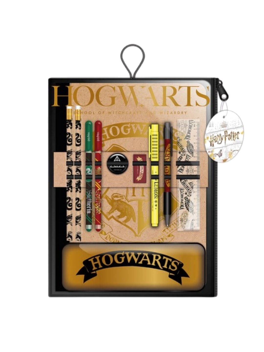 This Harry Potter Stationary Set contains every thing a young student might need at Hogwarts! - Officially licensed - Contains A4 notebook, gel pens, Eraser, Highlighter, Tin Pencil Case, Ruler, Sharpener, 2 pencils, Pen - Imported