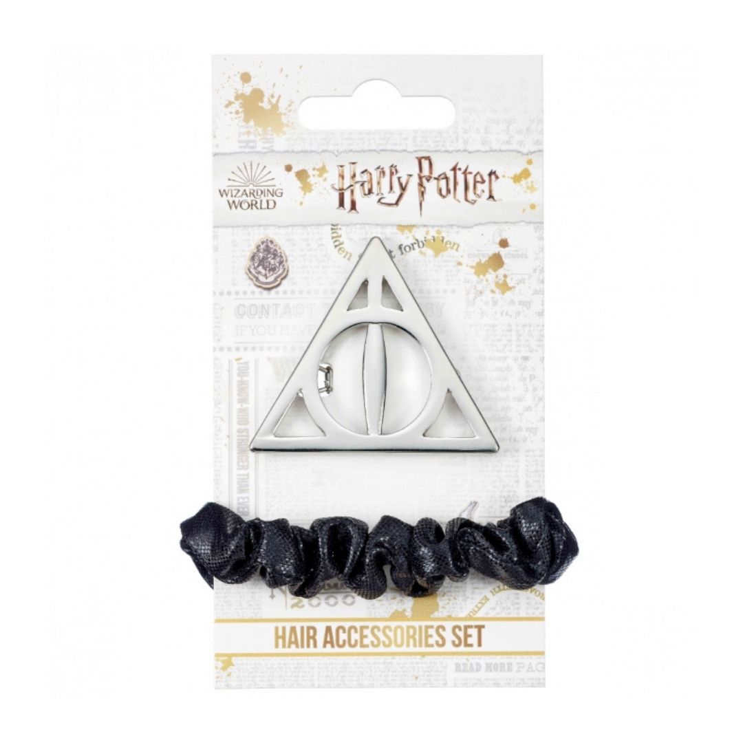 Add a magical touch to your hairstyle with this official Harry Potter hair accessory set! Inspired by the legendary Deathly Hallows – the Elder Wand, Resurrection Stone, and Cloak of Invisibility – this set includes a stylish clip and a mini scrunchie. Twist and clip to the side or attach to a ponytail for a charming Wizarding World look. A perfect gift for Harry Potter fans, presented on branded packaging. Created by The Carat Shop, the official licensed manufacturer of Harry Potter Jewellery & Accessories on behalf of Warner Bros.