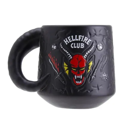 The black ceramic mug is embossed with the Hawkins High Hellfire Club logo from the Netflix original series Stranger Things, perfect for enjoying your favorite coffee or tea with your D&D-loving crew.