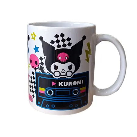 Cute meets retro in this Hello Kitty Kuromi Cassette Mug, bringing back the old-school cassette charm with a fun and nostalgic twist! With a 325ml capacity, it’s perfect for your morning coffee or tea. Featuring Kuromi next to a classic cassette, this mug adds a dash of vintage style to your drinkware. Made from durable ceramic, it’s both functional and collectible.