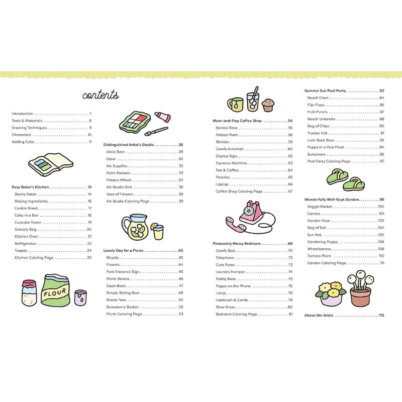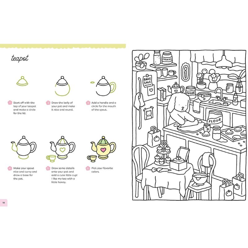 Follow Bobbie’s easy step-by-step illustrations to draw puppies, bunnies, bears, and more, then place them into delightful scenes like a coffee shop, a baker’s kitchen, or a summer pool party—and color them in with your favorite tools!