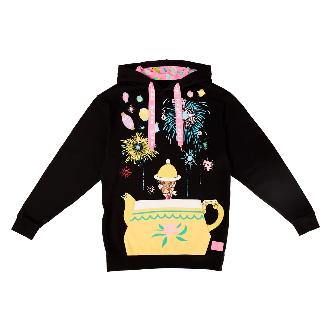Running late for the wildest non-birthday party ever? The Loungefly Disney Alice in Wonderland Unbirthday Unisex Hoodie is the perfect festive and cozy way to celebrate in style! The black base makes the vibrant pinks, blues, lavenders, and yellows truly pop. On the front, Disney’s Dormouse peeks out of a yellow teapot, which also functions as a hand-warming pocket. Around it, colorful stacked teacups and sweets marked “Take Me” and “Try Me”, while lanterns and fireworks burst above.