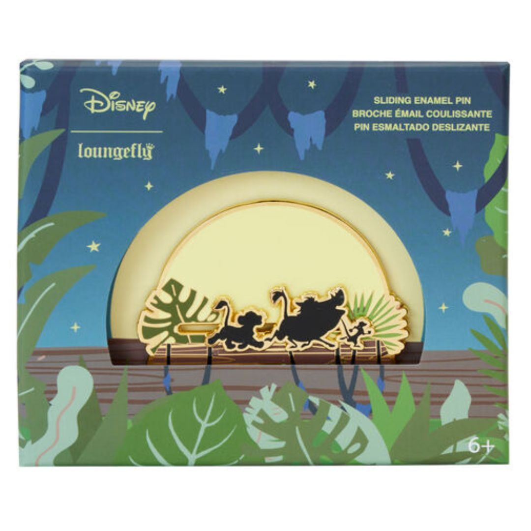 Kick back and live worry-free with the Loungefly Lion King 30th Anniversary Hakuna Matata 3” Collector Box Pin. This enamel pin shows a full moon as Timon, Pumbaa, and Simba walk across a log. The moon glows in the dark, and the trio can slide across the log for an interactive scene! A carefree addition to any outfit or bag, keeping you stylish and relaxed.
