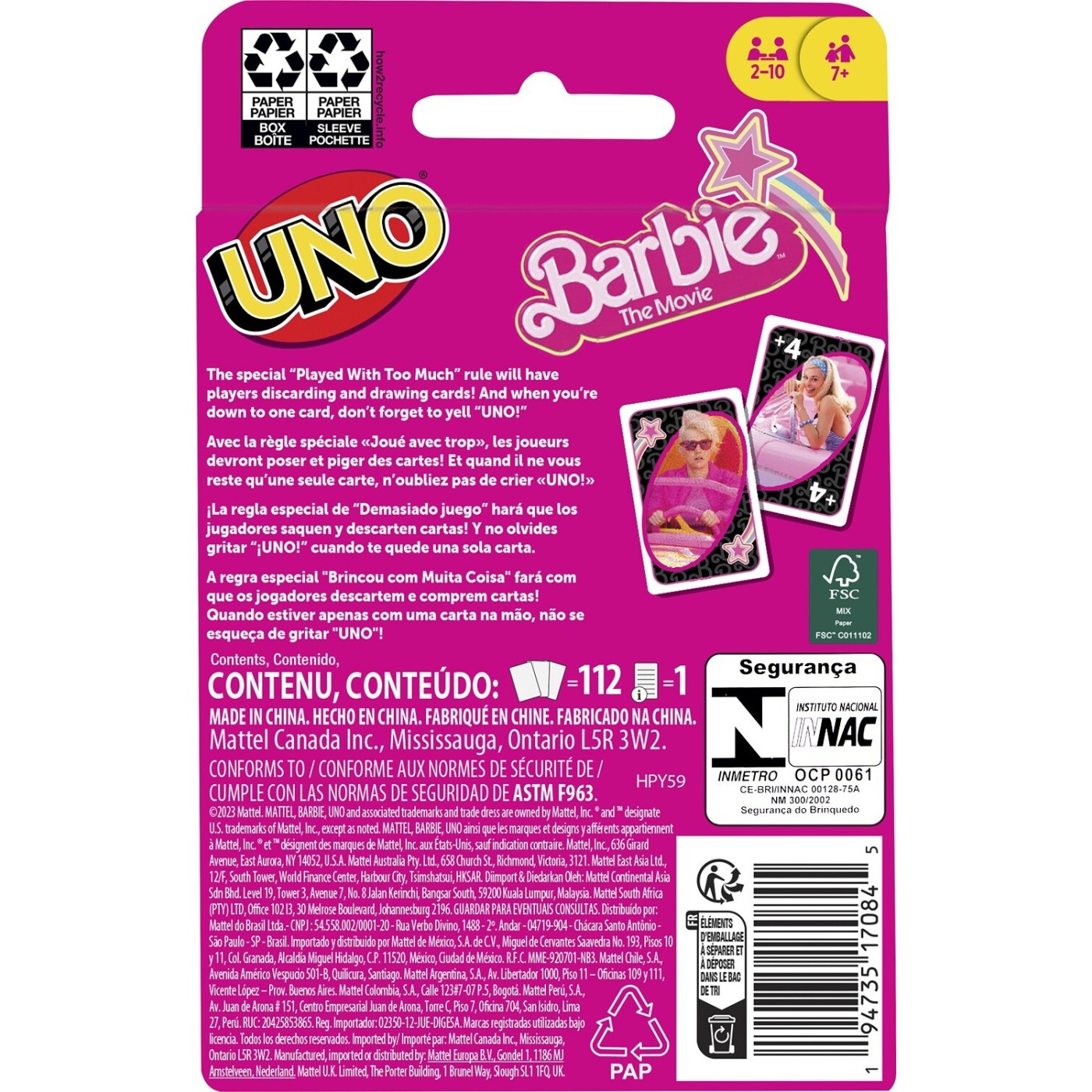 Barbie fans of all ages will love playing the special edition UNO Barbie The Movie card game! This themed deck features exclusive graphics inspired by iconic characters and scenes from the Barbie film, creating a fun and immersive twist on the classic card game. Match colors and numbers as always, but beware of the new "Played Too Much" rule, which spices up gameplay by making players draw or discard unpredictably!