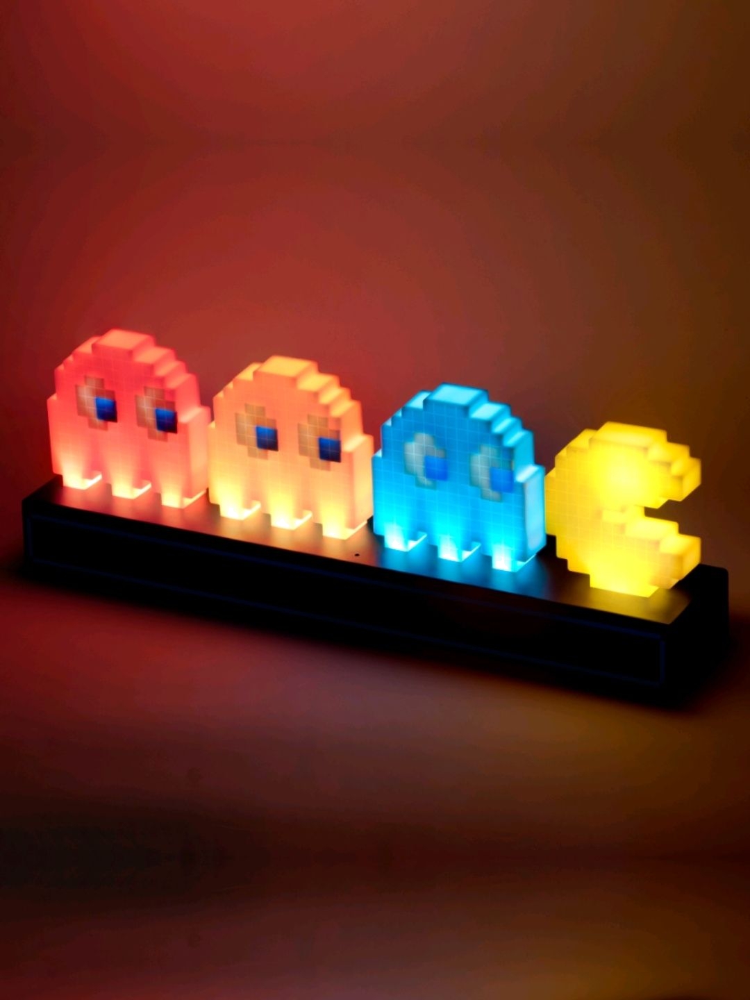 Elevate your space with the striking Pac-Man and Ghosts Light, a must-have addition for any retro gaming fan. Measuring 30cm (11.8") wide, this eye-catching light features Pac-Man and three of the iconic Ghost Gang — Blinky, Clyde, and Inky — all displayed on a sleek black base. When powered on, each character lights up, and two exciting modes enhance the experience: a colour phasing mode, where each figure lights up in sequence, and a music reactive mode that brings the light to life with sound. The light can be powered by USB (cable included) or 3x AAA batteries (not included), giving you flexibility in placement. An officially licensed PAC-MAN product, perfect for decorating any gamer's setup or living space.