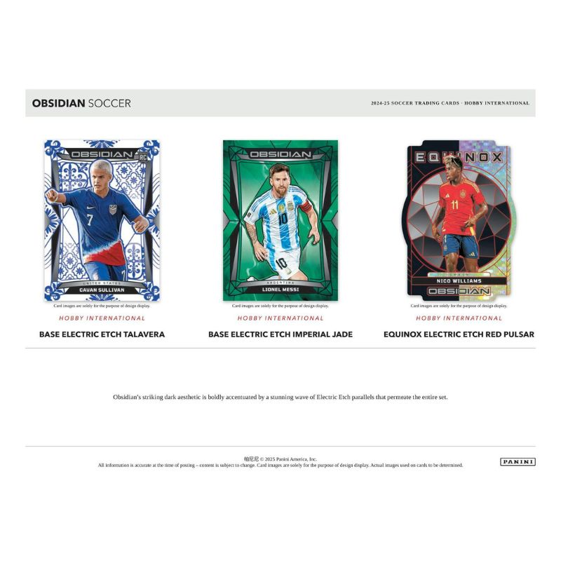 Panini America makes a strong return with the Obsidian Soccer 2024/25 International Hobby Box! The Obsidian series features a dark, bold design elevated by the Opti-chrome look and die-cut inserts, delivering a star-filled set packed with exciting parallels.