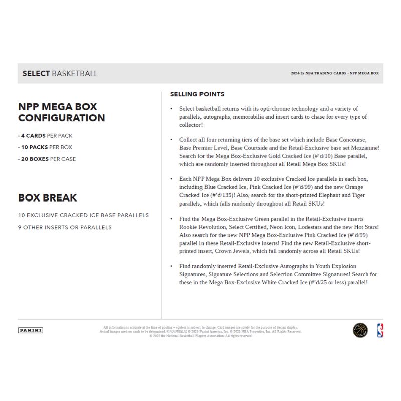 Panini Select Basketball returns for the 2024/25 season with stunning opti-chrome technology and a variety of parallels, autographs, memorabilia, and insert cards that every type of collector will chase! Collect all four base card tiers: Base Concourse, Base Premier Level, Base Courtside, and the Mega Box Exclusive Gold Cracked Ice (#’d/10) found randomly in select boxes.