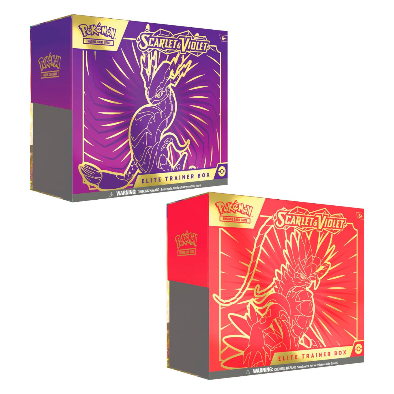 The Elite Trainer Box includes 9 booster packs, 1 full-art foil promo card of either Koraidon or Miraidon, 65 card sleeves, 45 Energy Cards, a player's guide and rulebook, 6 damage-counter dice, 1 competition-legal flip coin and 2 condition markers, all contained in a stylish collector's box.