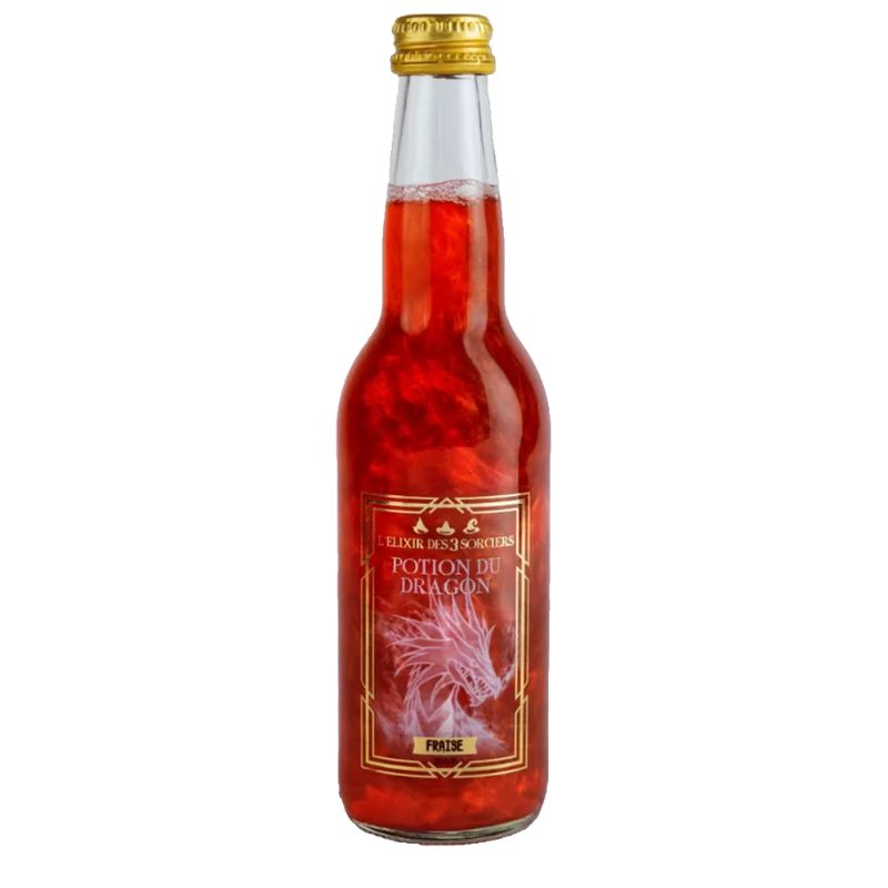The Potion Of Dragon Lemonade 330ml is a magical, non-alcoholic strawberry-flavored lemonade enhanced with sparkling edible glitter for a stunning visual effect. Suitable for both young and old, the best effect is achieved by swirling the bottle a few times before serving. This pasteurized drink contains no animal components or allergens, complying with the French regulations of 01/01/2020.