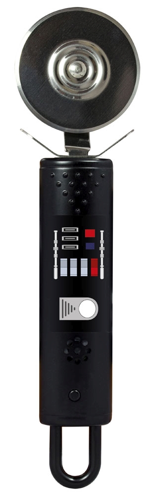 Cut your pizza with the help of the darkside - Darth Vader - Officially licensed Star Wars mercandise - Automatic sound - No buttons to push - Stainless steel cutting wheel-removable for easy cleaning - Replaceable long life batteries - Imported