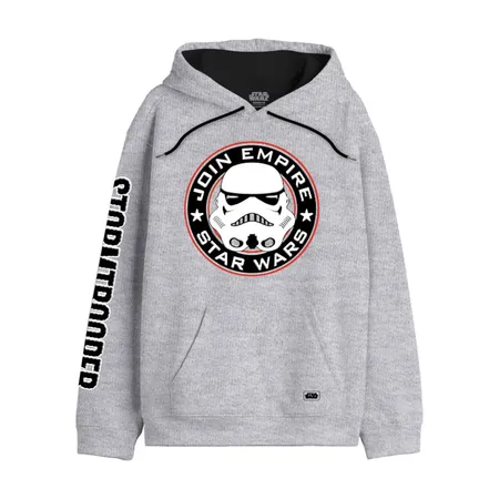 Made from soft, comfortable 100% cotton, it features an adjustable hood with black drawstrings and a kangaroo pocket, offering both functionality and comfort. The “Join Empire” emblem on the chest and Stormtrooper lettering on the sleeve add a unique touch of style.