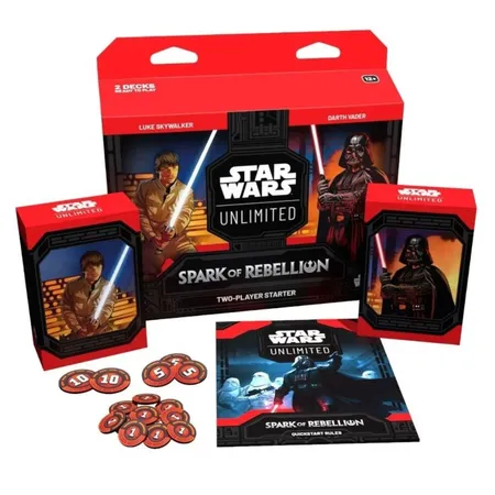 The Two-Player Starter Pack for the game’s first set, Spark of Rebellion, includes two fully-built, ready-to-play decks for you and a friend to dive in and start learning the game immediately. Protect your allies as Luke Skywalker or go on the offensive as Darth Vader!