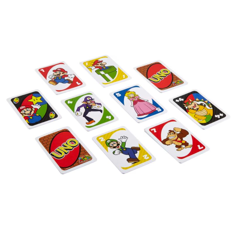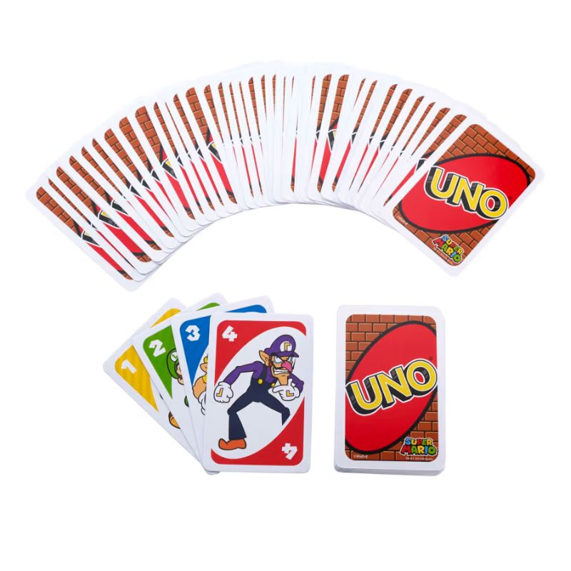 Το αγαπημένο παιχνίδι UNO™ επιστρέφει σε μια ειδική έκδοση με θέμα το Super Mario™! Οι παίκτες αγωνίζονται για να απαλλαγούν από όλες τις κάρτες τους, ταιριάζοντας μία κάρτα από το χέρι τους με την κάρτα που βρίσκεται στην κορυφή της στοίβας απόρριψης. Το παιχνίδι περιλαμβάνει ειδικές κάρτες δράσης, όπως η κάρτα Mario Super Star, η οποία προσφέρει μοναδικές ανατροπές στο παιχνίδι. Όταν ένας παίκτης μείνει με μία μόνο κάρτα, πρέπει να φωνάξει "UNO!" για να ανακοινώσει την πρόοδό του. Ιδανικό για φίλους του Super Mario™ και λάτρεις των παιχνιδιών καρτών, ηλικίας 7 ετών και άνω.