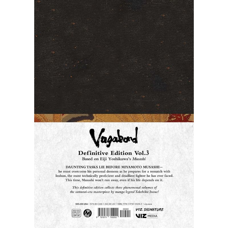 This large-trim Definitive Edition with a gorgeous textured cover collects three phenomenal volumes of the samurai-era masterpiece by manga legend Takehiko Inoue. Striving for enlightenment through the sword, Miyamoto Musashi is ready to cut down anyone who stands in his path. Vagabond is an action-packed portrayal of the life and times of the most celebrated swordsman and warrior-philosopher of all time.