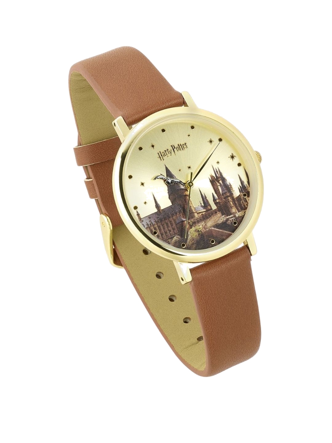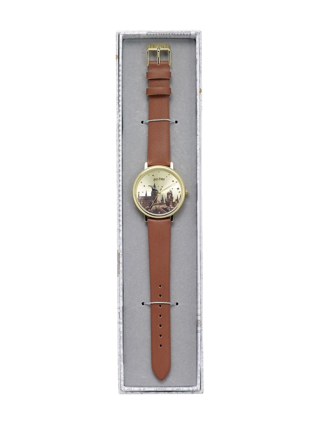 Official Harry Potter Hogwarts Castle Watch by The Carat Shop This watch features the iconic Hogwarts castle on the face, where many a wizard has been trained. The watch case is gold plated and the strap is faux leather Tan PVC The watch is presented in official Harry Potter box and packaging. - Officially licensed - Imported